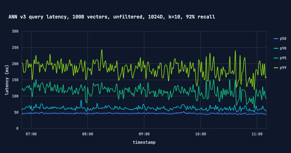 Our latest ANN release supports scales of 100+ billion vectors in a single search index, with 200ms p99 query latency at 1k QPS and 92% recall.